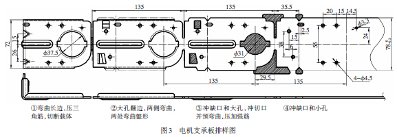 電機支承板排樣圖如圖3所示,制件采用4個工位生產,采用中間載體來連接工序件。